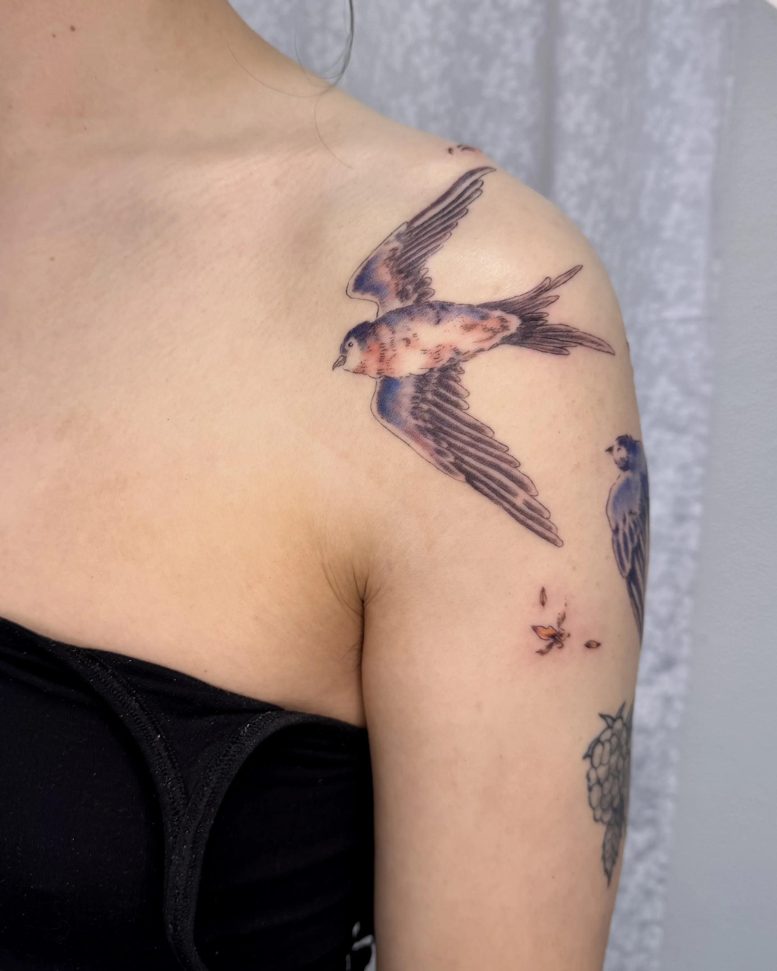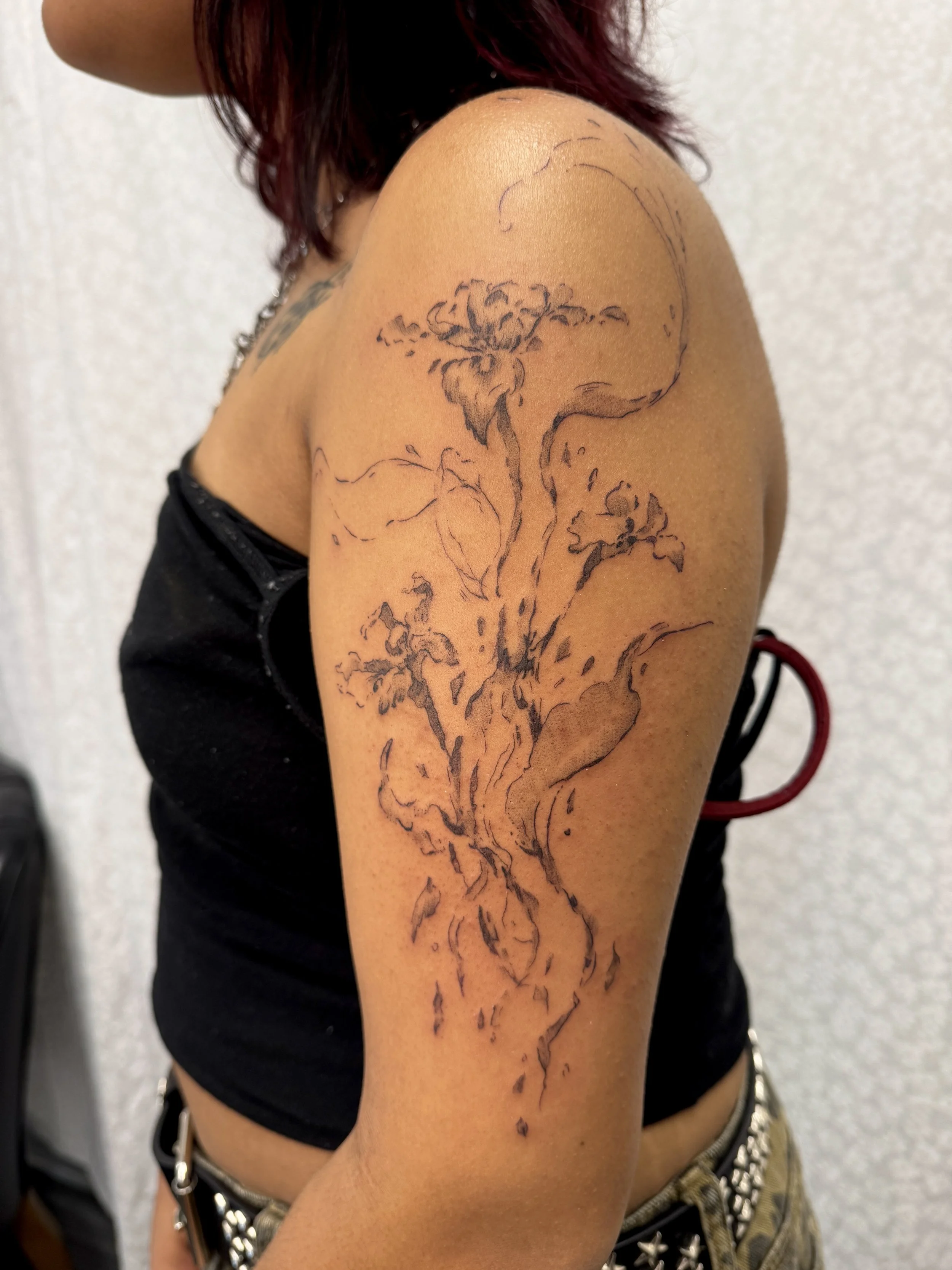 Their tattooing practice centers softness, presence, and collaboration, offering clients an affirming and grounded space to adorn themselves with art that feels both intentional and alive. Inspired by the whimsy of the natural world and the dreamy textures of memory and imagination, Jasmyn’s visual language blends delicate linework with florals, vines, and botanical elements—evoking a sense of wonder, ritual, and magic.